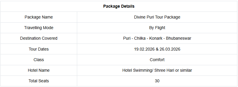 Immerse yourself in a divine Puri tour package by IRCTC tourism. This all-inclusive tour package covers Bhubaneswar, Puri, Chilika, and Konark for 3 nights and 4 days. Package price starts from just ₹ 32,500/- pp*. Book your divine tour now!https://t.co/KKcKuUvYau… pic.twitter.com/9fYhgRJbP9— IRCTC (@IRCTCofficial) February 19, 2026